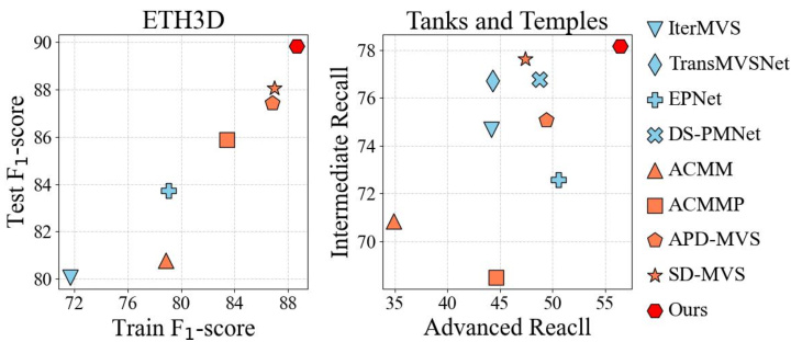 Figure 1: Comparison with the SOTA traditional methods and learning-based methods. Our method achieves the best  $\mathrm{F_{1}}$  -score on ETH3D and the best recall on Tanks & Temples.