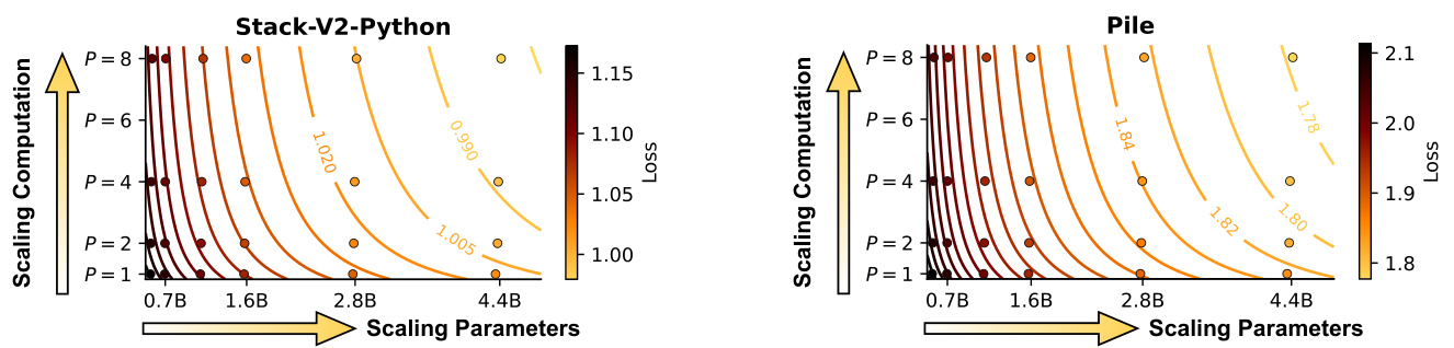 Our pre-training is conducted on two widely utilized datasets: Stack-V2 (Python subset) (Lozhkov et al., 2024) and Pile (Gao et al., 2021). Pile serves as a general corpus aimed at enhancing common sense and memorization skills, while Stack-V2 focuses on code comprehension and reasoning skills. Analyzing PARSCALE across these contexts can assess how parameters and computations contribute to different skills.