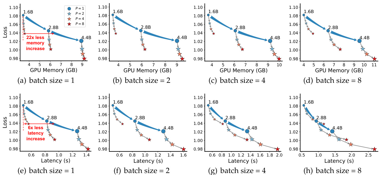 我们的初步理论分析表明,PARSCALE的损失可能遵循类似于Chinchilla缩放律 (Hoffmann et al., 2022) 的幂律。随后我们在Stack-V2 (Lozhkov et al., 2024) 和Pile (Gao et al., 2021) 语料库上进行了大规模预训练实验,将$P$从1调整到8,模型参数从500M调整到4.4B。我们利用这些结果拟合了一个新的并行缩放律,该定律推广了Chinchilla缩放律,如图1(2)所示。结果表明,将模型并行化为$\mathbf{P}$个流相当于将模型参数缩放${\mathcal{O}}(1{\bf o g}P)$。在综合任务上的结果验证了这一结论。与参数缩放不同,PARSCALE引入的参数可忽略不计,仅略微增加空间开销。它还利用了对GPU友好的并行计算,将大语言模型解码中的内存瓶颈转移为计算瓶颈,因此不会显著增加延迟。例如,对于一个1.6B的模型,当使用PARSCALE缩放到$P=8$时,与达到相同模型容量的参数缩放相比 (批大小$=1$,详见第3.3节),其内存增加量减少了$\bf{22\times}$,延迟增加量减少了$6\times$。图1(3)展示了PARSCALE具有更优的推理效率。