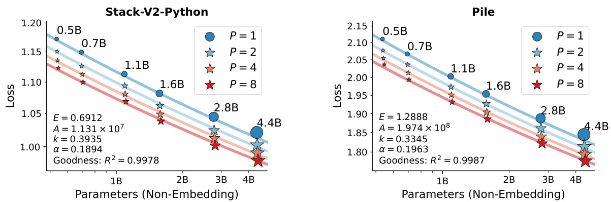 Parametric Fitting We plot the results in Figure 2, where each point represents the loss of a training run, detailed in Appendix F. We observe that increasing $P$ yields benefits following a logarithmic trend. Similar gains are seen when raising $P$ from 1 to 2, 2 to 4, and 4 to 8. Thus, we preliminarily try the following form:
