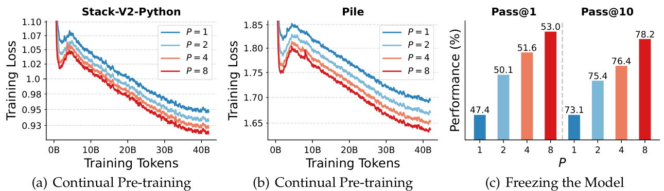 Figure 6: (a)(b) Loss for continual pre-training the Qwen-2.5-3B model on the two datasets. (c) Code generation performance after fine-tuning on Stack-V2 (Python), averaged from HumanEval $(+)$ and $\mathrm{{\check{M}B P P}}(+)$ . We only fine-tune the introduced parameters (prefix tokens and aggregation weights), with different $P$ sharing exactly the same Qwen2.5-3B pre-trained weights.