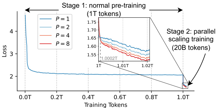 Training Loss Figure 5 intuitively demonstrates the loss curve during our two-stage training. We find that at the beginning of the second phase, the loss for $P>1$ initially exceed those for $P=1$ due to the introduction of randomly initialized parameters. However, after processing a small amount of data (0.0002T tokens), the model quickly adapts to these newly introduced parameters and remains stable thereafter. This proves that PARSCALE can take effect rapidly with just a little data. We can also find that in the later stages, PARSCALE yields similar logarithmic gains. This aligns with previous scaling law findings, suggesting that our earlier conclusions for from-scratch pre-training — parallelism with $P$ streams equates to a ${\check{\mathcal{O}}}(N\log(P))$ increase in parameters — also applies to continued pre training. Additionally, larger $P$ (such as $P=8$ ) can gradually widen the gap compared to smaller $P$ values (such as $P=4^{\cdot}$ ). This demonstrates that parallel scaling can also benefit from data scaling.