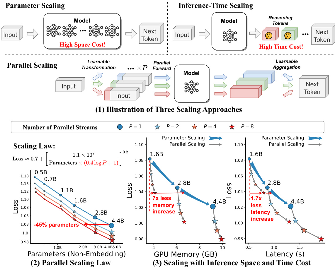 Our preliminary theoretical analysis suggests that the loss of PARSCALE may follow a power law similar to the Chinchilla scaling law (Hoffmann et al., 2022). We then carry out large-scale pre-training experiments on the Stack-V2 (Lozhkov et al., 2024) and Pile (Gao et al., 2021) corpus, by ranging $P$ from 1 to 8 and model parameters from 500M to 4.4B. We use the results to fit a new parallel scaling law that generalizes the Chinchilla scaling law, as depicted in Figure 1(2). It shows that parallel i zing into $\mathbf{P}$ streams equates to scaling the model parameters by ${\mathcal{O}}(1{\bf o g}P)$ . Results on comprehensive tasks corroborate this conclusion. Unlike parameter scaling, PARSCALE introduces negligible parameters and increases only a little space overhead. It also leverages GPU-friendly parallel computation, shifting the memory bottleneck in LLM decoding to a computational bottleneck and, therefore, does not notably increase latency. For example, for a 1.6B model, when scaling to $P=8$ using PARSCALE, it uses $\bf{22\times}$ less memory increase and $6\times$ less latency increase compared to parameter scaling that achieves the same model capacity (batch size $=1$ , detailed in Section 3.3). Figure 1(3) illustrates that PARSCALE offers superior inference efficiency.