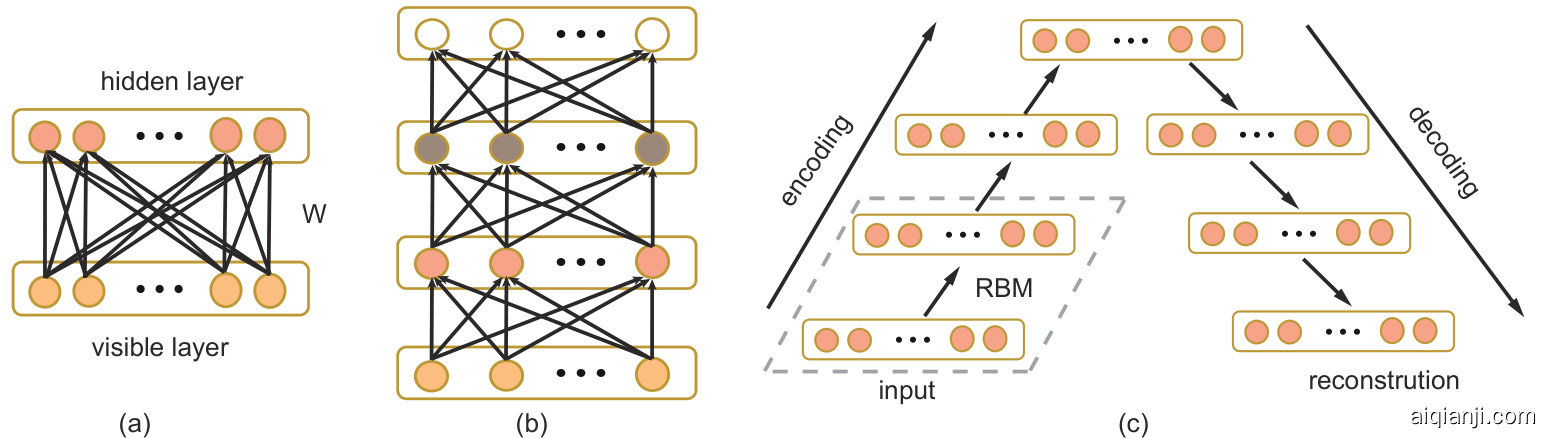 图 2: (a) RBM包含隐藏层神经元通过权重W与可见层神经元连接。(b) 使用反向传播对所有层进行监督微调的DBN。(c) 使用反向传播对所有层进行无监督微调的展开DBN图示。