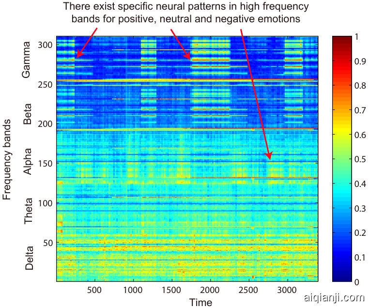 After extracting differential entropy features from five frequency bands (Delta, Theta, Alpha, Beta and Gamma), we further investigate the neural patterns associated with different emotions. The DE feature map of one experiment is shown in Fig. 6. We find that there exist specific neural patterns in high frequency bands for positive, neutral and negative emotions through time-frequency analysis. For positive emotion, it shows that energy of beta and gamma frequency bands increases whereas neutral and negative emotions have lower energy of beta and gamma frequency bands. While the neural patterns of neutral and negative emotions have similar patterns in beta and gamma bands, neutral emotions have higher energy of alpha oscillations. These findings provide fundamental evidences for understanding the mechanism of emotion processing in the brain.