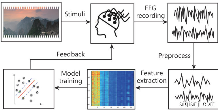 With the fast development of wearable devices and dry electrode techniques [11]–[14], it enables us to record and analyze the brain activity in natural settings. This development is leading to a new trend that integrates brain-computer interfaces (BCIs) with emotional factors. Emotional braincomputer interfaces are closed-loop affective computing systems, which build interactive environments [37]. Figure 1 shows the emotional brain-computer interface cycle. Emotional brain-computer interfaces consist of the following six main phases. First, users are exposed to designed or realworld stimuli according to the protocol. The brain activities are recorded as EEG simultaneously. Then the raw data will be pre processed to remove noise and artifacts. Some relevant features will be extracted and a classifier will be trained based on the extracted features. After identifying user current emotional states, a feedback can be implemented to respond to the users.