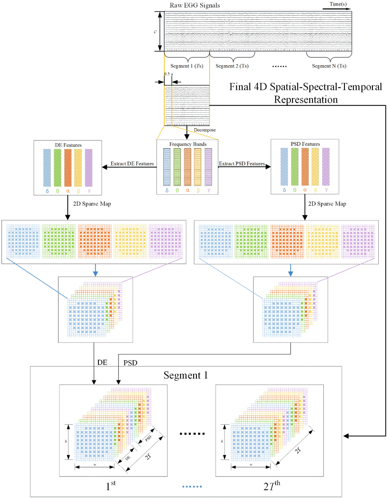 The process of generating 4D representation is depicted in Fig. 2. As previous works do (Shen et al. 2020; Yang et al. 2018a), we split original EEG signals into $T$ seconds long segments without overlapping. Each segment is assigned with the same label as the original EEG signals. Then we decompose each segment into five frequency bands (i.e. δ[1~4 Hz], $\mathsf{\theta}[4{\sim}8\mathrm{Hz}]$ , $\mathsf{a}[8{\sim}14~\mathrm{HZ}]$ , $3[14{\sim}31~\mathrm{Hz}]$ , and $\gamma[31{\sim}51~\mathrm{Hz}].$ ) with five-order Butterworth filters. The Differential Entropy (DE) features and Power Spectral Density (PSD) features of all EEG channels, which have been proven to be effective for emotion recognition (Zheng et al. 2017), are extracted from five frequency bands respectively with a 0.5s window for each segment.