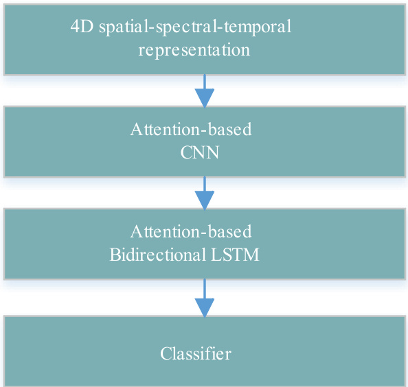 Figure 1 illustrates the overall structure of 4D-aNN for EEG emotion recognition. It consists of the 4D spatial-spectraltemporal representation, the attention-based CNN, the attention-based bidirectional LSTM, and the classifier. We will describe the details of each part in sequence.