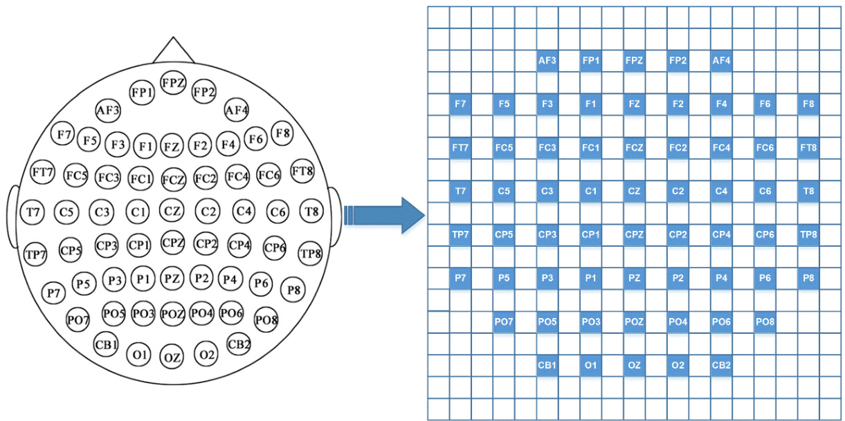 Fig. 3 The 2D sparse map with zero-padding of 62 channels. The purpose of the organization is to preserve the positional relationships among different electrodes.