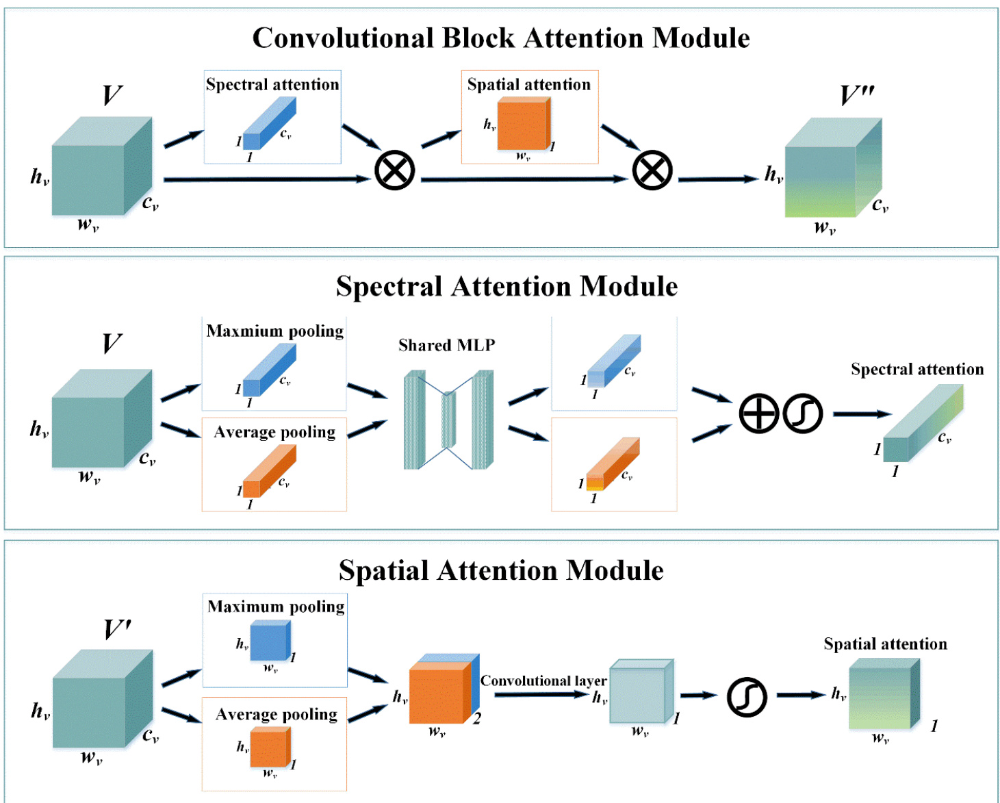 图 5: 顶部模块展示了卷积注意力块的整体结构,由频谱注意力模块和空间注意力模块组成。中间模块表示频谱注意力的生成过程。底部模块展示了空间注意力的生成机制。
