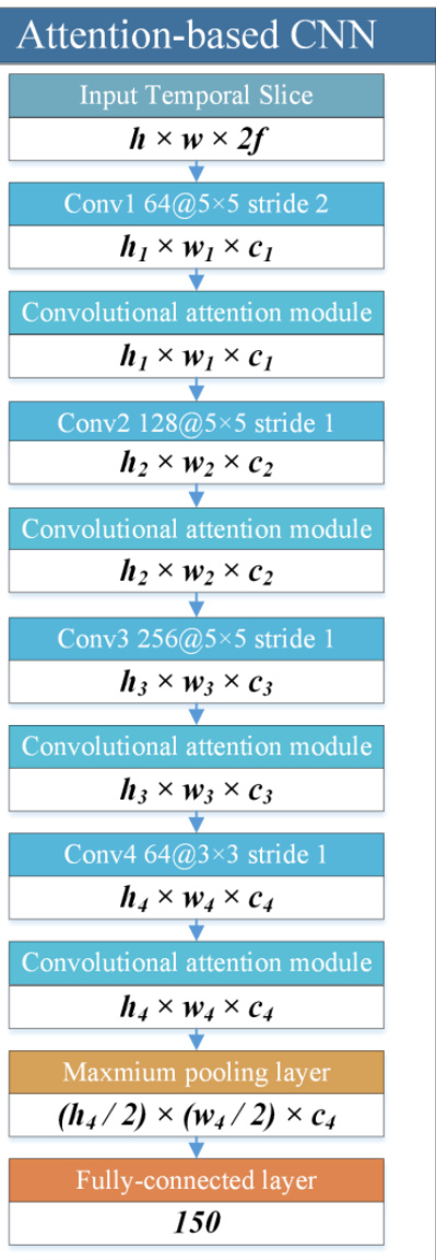 The structure of the attention-based CNN is shown in Fig. 4. It contains four convolutional layers, four convolutional attention modules, one max-pooling layer, and one fullyconnected layer. The four convolutional layers have 64, 128, 256, and 64 feature maps with the filter size of $5\times5$ , $5\times5$ , $5\times5$ , and $3\times3$ , respectively. Specifically, a convolutional attention module is used after each convolutional layer to utilize the spatial and spectral attention mechanisms, and the details will be given later. We only use one max-pooling layer with a filter size of $2\times2$ after the last convolutional attention module to preserve more information and enhance the robustness of the network. Finally, outputs of the max-pooling layer are flattened and fed to the fully-connected layer with 150 units. Thus, for each temporal slice $S_{i}$ , we take the final output $P_{i}\in R^{150}$ as its spatial and spectral representation.