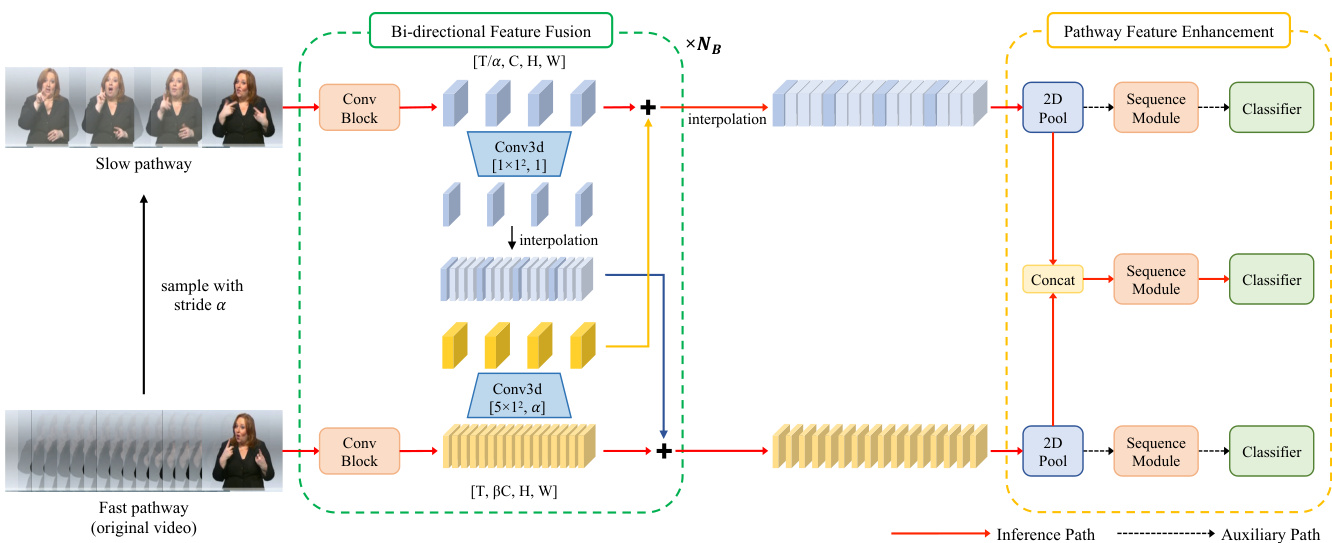 To tackle these aforementioned problems, we adopt the architecture of the SlowFast network [14], which is composed of two distinct pathways: (1) Slow pathway, operating at low frame rate to capture spatial semantics, and (2) Fast pathway, operating at high frame rate to capture motion with finer temporal resolution. The most notable difference between previous literature is that we intentionally extract spatial and dynamic features separately by using two independent sub networks. This is achieved by employing distinct models specialised in capturing either spatial or dynamic aspects. Given the nature of CSLR where single frame or sequences represent meaningful characters, we introduce the Bi-directional Feature Fusion (BFF) method. This approach efficiently transfers important features to both Slow and Fast pathways with only a minimal increase in computational overhead and model parameters. Furthermore, since the contents of the Slow and Fast pathways have different characteristics, we also propose Pathway Feature Enhancement (PFE). This method enhances sequence features from each pathway, enabling a comprehensive understanding of sign language’s spatial and dynamic context. We evaluate our method on three widely used datasets, PHOENIX14 [15], PHOENIX14-T [16], and CSL-Daily [17]. Through comprehensive ablation experiments for CSLR, we showcase the effectiveness of the proposed feature fusion methods. Our model establishes state-of-the-art performances across all datasets with notable improvement over the previous works.