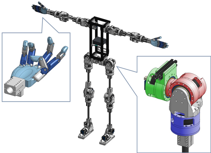 Fig. 5. An alternative adult-sized robot configuration with 7 degrees-offreedom leg and dexterous hand. Carbon fiber tubes that are also available from online vendors are used to increase the length of the legs to match an average adult. Colors are used to show joint orientation (green: thigh pitch; red: abduction; blue: thigh rotation).