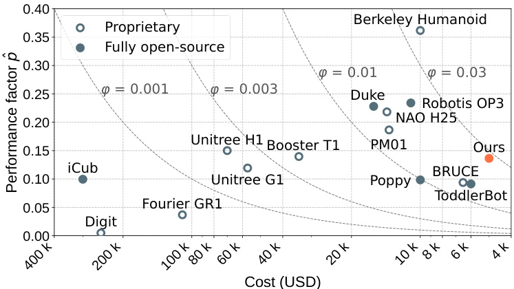 图 3: 现有机器人平台对比。Y轴表示性能因子 $\hat{p}$ (定义见公式(1)),代表机器人平均峰值扭矩与重量和高度归一化后的比值。性价比指标 $\varphi$ (定义见公式(2))越高表明成本效益越好,开源硬件和软件平台支持针对特定用户需求进行定制。