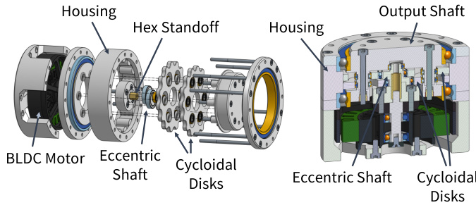 Actuators play a crucial role in robotic platforms, directly impacting performance, efficiency, and capabilities. Various design configurations have been explored to optimize robotic actuators. Katz [14] developed a fully open-source, highperformance, proprio ce pti ve actuator, including a custom motor driver for quadrupedal robots. Their design utilizes an offthe-shelf motor and a planetary gear component set, requiring modifications to both the motor and gears, along with a custom aluminum housing. Gealy et al. [10] employed belt reduction systems as modular actuators for the arm. Similarly, Kau et al. [15] demonstrated promising results in quadrupedal robotics by utilizing belt drive and ODrive [25] as the motor controller, however, their design features a low gear ratio and lacks modularity. In addition, Grimminger et al. [12] and Withrich et al. [39] presented a series of open-source works incorporating belt reduction and custom motor drivers for small-scale legged robots. Urs et al. [36] introduced a 3D-printed planetary gearbox combined with the Moteus [23] motor driver, though their approach requires a resin 3D printer. Azocar et al. [4] developed fully open-source actuators with planetary gearing for prosthetic applications, but their method necessitates CNC machining. Furthermore, Roozing and Roozing [30] investigated the design considerations for manufacturing cycloidal gearboxes using Fused Deposition Modeling (FDM) 3D printing. In a subsequent study, Roozing and Roozing [31] proposed a non-pinwheel design, optimizing the form for 3D-printed actuators. Their research highlights the feasibility of integrating 3D-printed cycloidal drives into actuators, paving the way for low-cost, accessible, and reliable robotic systems.