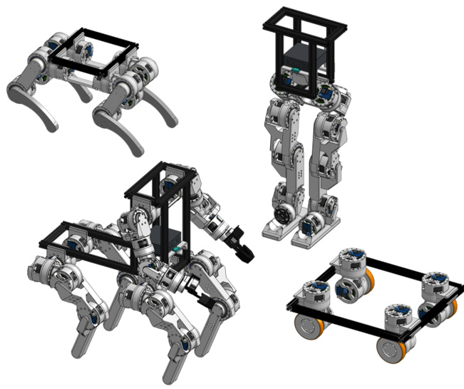 Fig. 6. With minimal modifications, the modular joint actuators can be arranged to form different robot morph o logie s. Example forms include quadruped (top-left), biped (top right), Centaur-like (bottom-left), and mobile base (bottom-right).