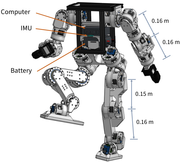 The Berkeley Humanoid Lite is a mid-scale humanoid robot platform that is designed with accessibility and custom iz ability in mind. The main components of the robot are shown in Figure 2. The robot weighs $16~\mathrm{kg}$ and stands $0.8\mathrm{m}$ tall. Two sizes of actuators, each incorporating a 3D-printed cycloidal gearbox, directly drive the joints in the legs and arms. The torso is built with aluminum extrusions to support mounting additional components, and a cellphone-grade IMU is positioned near the center of the torso.
