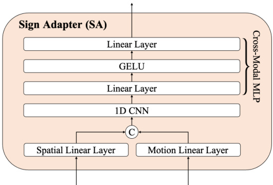 In the previous sections, we extracted two distinct visual features: the spatial features $Z_{s}$ and the motion features $Z_{m}$ . These features differ in both their dimensions and representation, as depicted in Figure 2. To effectively integrate these features, we introduce an additional module called Sign Adaptor (SA). As shown in Figure 3, SA includes linear projection layers, a 1D CNN, and a Multi-Layer Perceptron (MLP). These components work together to integrate the spatial and motion features into a unified sign representation, denoted as $Z_{s m}$ . First, the spatial and motion features are passed through linear projection layers to transform them into features with matching dimensions. Next, the 1D CNN is applied for short-term modeling of the combined features. Finally, a cross-modal MLP (Liu et al., 2024a) is employed to bridge the visual and textual modalities. The resulting outputs are represented as $Z_{s m}\in\mathbb{R}^{M\times d^{\prime}}$ , where $M$ represents the reduced number of frames after convolution, and $d^{\prime}$ is the dimension aligned with that of the LLM. Although SA aids in bridging the modality gap between visual and textual features during training under the SLT supervision, the gap remains. To tackle this issue, we introduce VT-Align, which will be detailed in the next section.