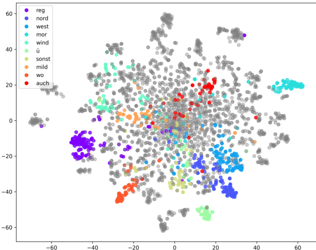 图 5: 手语特征的 t-SNE 可视化。不同颜色代表具有不同语义的特征,灰色点表示未列出的其他类别。