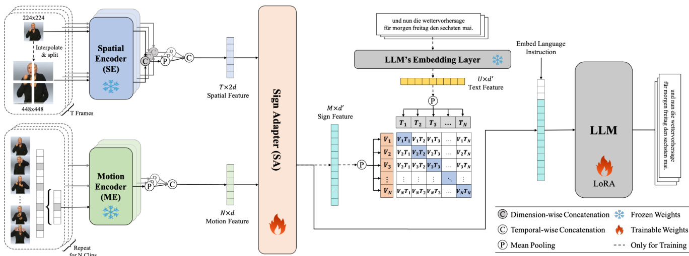 Given a sign video $X={x_{i}}{i=1}^{T}$ , where each frame $x_{i}\in{\overset{\cdot}{\mathbb{R}}}^{H\times W}$ represents a frame with height $H$ and width $W$ , the objective of SLT is to generate a corresponding spoken language sentence $Y={y_{j}}_{j=1}^{U}$ , composed of $U$ words. Previous gloss-free methods (Zhou et al., 2023; Wong et al., 2024; Gong et al., 2024; Chen et al., 2024) have involved fine-tuning visual encoders using sign language data to make them more domain-specific, leading to improvements in translation accuracy. However, while this fine-tuning introduces more domain knowledge at the feature extraction level, it is unnecessary, especially with LLMs, which already maintain rich visual information from the visual encoder in their latent space (Zhang et al., 2024c). Although there may be a trade-off, we argue that utilizing the spatial configurations and motion dynamics with proper alignment and training, offers a more efficient and effective solution.