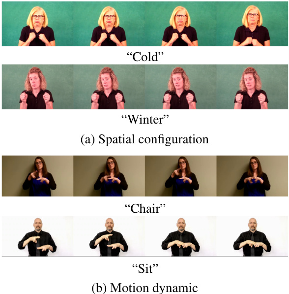 图 1: 手语空间构型与运动动态的视觉示例。图像来源于WLASL (Li et al., 2020a)。