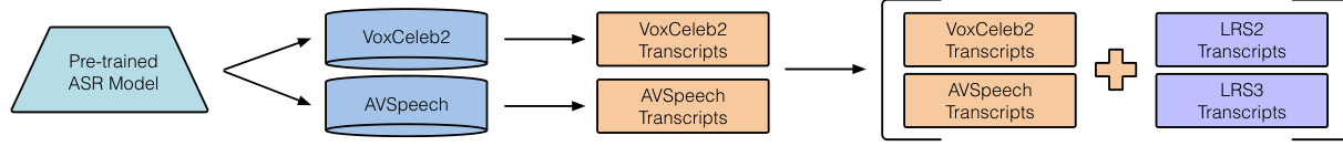 In order to investigate the impact of the size of training data on the performance of audio-only, visual-only and audio-visual models, we scale the training sources by including publicly-available audiovisual clips into the training set. An overview of our label generation pipeline can be found at the top of Fig. 1. To be specific, audio waveforms from the unlabelled audio-visual datasets are fed into a pretrained ASR model to produce automatic transcriptions. For the purpose of this study, we use two unlabelled datasets: VoxCeleb2 [17] and AVSpeech [18]. In particular, AVSpeech [18] contains 4 700 hours of YouTube video segments in multiple languages, and VoxCeleb2 [17] consists of 2 300 hours of video segments from more than 6 000 people. However, we are interested in training models in English. Thus, we use the Vox Lingua 107 language classifier [19] to filter the AVSpeech dataset, resulting in a total of 1 323 hours; the list of English data we use for VoxCeleb2 is obtained from [7], and comprises 1 307 data hours. Next, we leverage publicly-available ASR models to produce automatically generated transcriptions. It is worth pointing out that our work facilitates reproduction and comparison since all datasets and models used are publicly accessible.