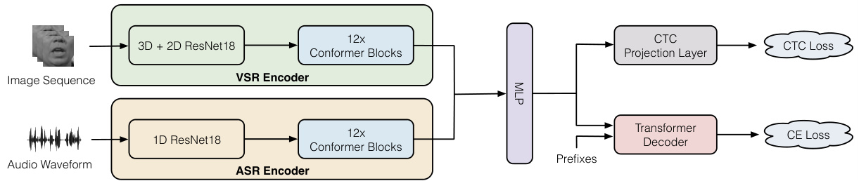 We adopt the off-the-shelf architecture presented in [22], which has achieved state-of-the-art performance on the LRS2 and LRS3 datasets without the use of external data. The architecture is shown at the bottom of Fig. 1. In particular, the VSR front-end is based on a modified ResNet-18 [23, 24], where the first layer is a spatiotemporal convolutional layer with a kernel size of $5\times7\times7$ and a stride of $1\times2\times2$ . The temporal back-end, which follows the frontend, is a Conformer [20]. Similarly, the ASR encoder consists of a 1D ResNet-18 [25] followed by a Conformer. The ASR and VSR encoder outputs are fused via a multi-layer perceptron (MLP). The rest of the network consists of a projection layer and a Transformer decoder for joint CTC/attention training [26].