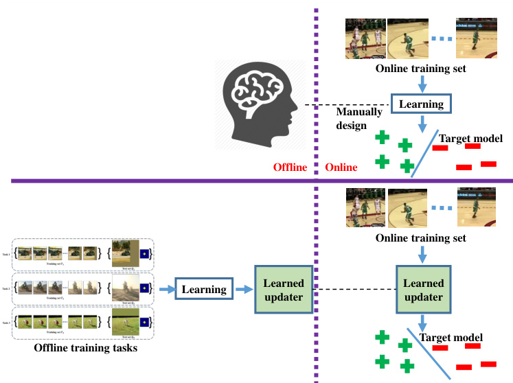 Fig. 1: A general introduction of learning to update. Top: Typically, a learning algorithm (e.g., SGD) is manually designed for online learning of the target model. Bottom: Contrarily, a learned updater is adopted for online learning, which is offlinetrained using large numbers of videos. All figures are best viewed in color.