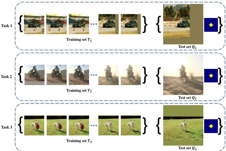 从缩放后的图像中按时间顺序采样 $N$ 帧图像子集。前 $N-1$ 帧以目标为中心裁剪为 $127\times127$ 大小,作为目标的训练集。最后一帧同样以目标为中心裁剪为 $255\times255$ 大小,作为测试集。需要注意的是,由于我们的基础跟踪器具有平移不变性,测试集采用更大图像块($255\times255$ 可视为多个 $127\times127$ 图像的集合)。训练集与测试集示例详见 图 2。