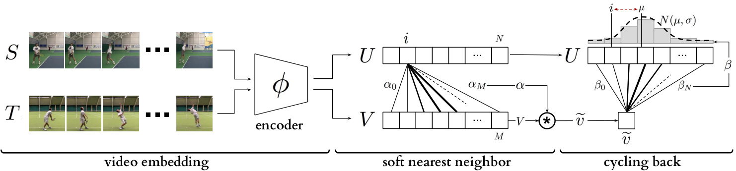Figure 3: Temporal cycle consistency. The embedding sequences  $U$   and  $V$  are obtained by encoding video sequences  $S$   and  $T$   with the encoder network  $\phi$  , respectively. For the selected point   $u_{i}$   in  $U$  , soft nearest neighbor computation and cycling back to  $U$   again is demonstrated visually. Finally the normalized distance between the index  $i$   and cycling back distribution  $N(\mu,\sigma^{2})$   (which is fitted to  $\beta$  ) is minimized.