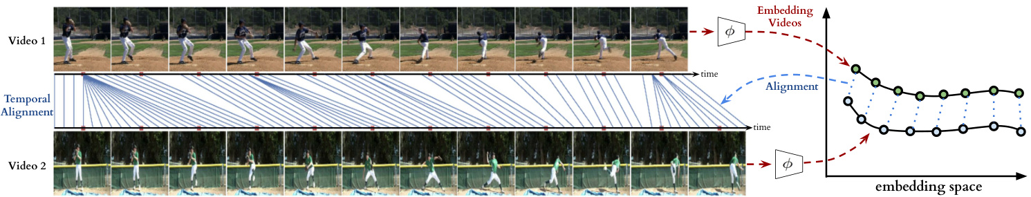 当存在逐帧对齐(即监督)时,学习对应关系简化为从对齐的帧对中学习共同的嵌入空间(例如CCA [3, 4] 和排序损失 [35])。然而,对于大多数现实世界序列,这种逐帧对齐并不自然存在。一种选择是通过多台摄像机记录同一事件来人工获取对齐序列 [30, 35, 37]。此类数据收集方法可能难以捕捉自然视频中存在的所有变化。另一方面,我们的自监督目标不需要显式对应关系来对齐不同序列。它可以对齐动作类别内的显著变化(例如倒液体或棒球投球)。有趣的是,通过学习对齐产生的嵌入被证明对视频的细粒度时间理解非常有用。更具体地说,我们学习了一个嵌入空间,该空间在动作类别内的视频序列对之间最大化一对一映射(即循环一致点)。为此,我们引入了两种可微分的循环一致性计算版本,可以通过传统的基于梯度的优化方法进行优化。该方法的更多细节将在第3节中解释。