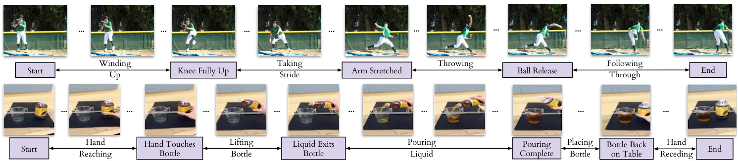 图 4: "棒球投球"(上排)和"倒水"(下排)动作的示例标签。关键事件显示在帧下方的方框中(例如"手触碰瓶子"),两个关键事件之间的每一帧都有阶段标签(例如"举起瓶子")。