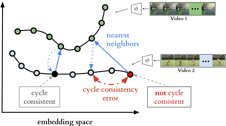 图 2: 循环一致性表示学习。我们展示了在示例嵌入空间中编码的两个视频序列。若采用最近邻匹配,一个点(黑色所示)能循环回到自身,而另一个点(红色所示)则不能。我们的目标是学习一个能使最多点实现自我循环的嵌入空间,通过最小化每对序列中每个点的循环一致性误差(红色虚线所示)来实现这一目标。