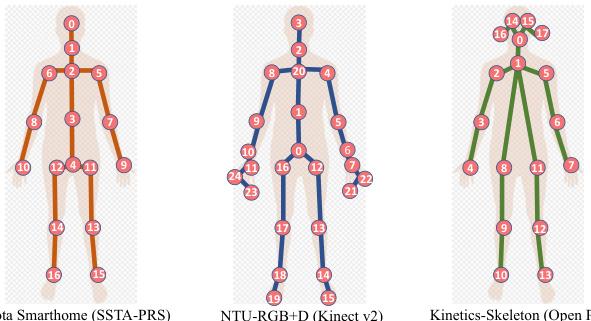 Figure 2. Human joint labels of three datasets: Toyota Smarthome (left), NTU $_\mathrm{RGB+D}$ (middle) and Kinetics-Skeleton (right). We note the different numbers, orders and locations of joints.