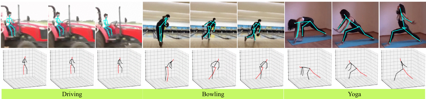 Figure 1. Skeleton-based action recognition. In this paper we introduce a generic skeleton-based action recognition model UNIK, and report significant improvements by using our model pre-trained on Posetics, a real-world, large, human skeleton video dataset.