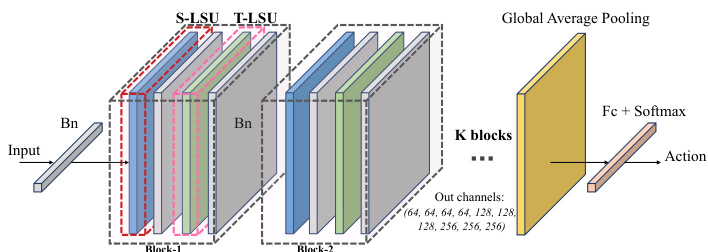 Figure 3. Overall architecture. There are K blocks with a 1D Batch normalization layer at the beginning, a global average pooling layer and a fully connected classifier at the end. Each block contains a Spatial Long-short dependency Unit (S-LSU), a Temporal Long-short dependency Unit (T-LSU) and two Batch normalization layers.