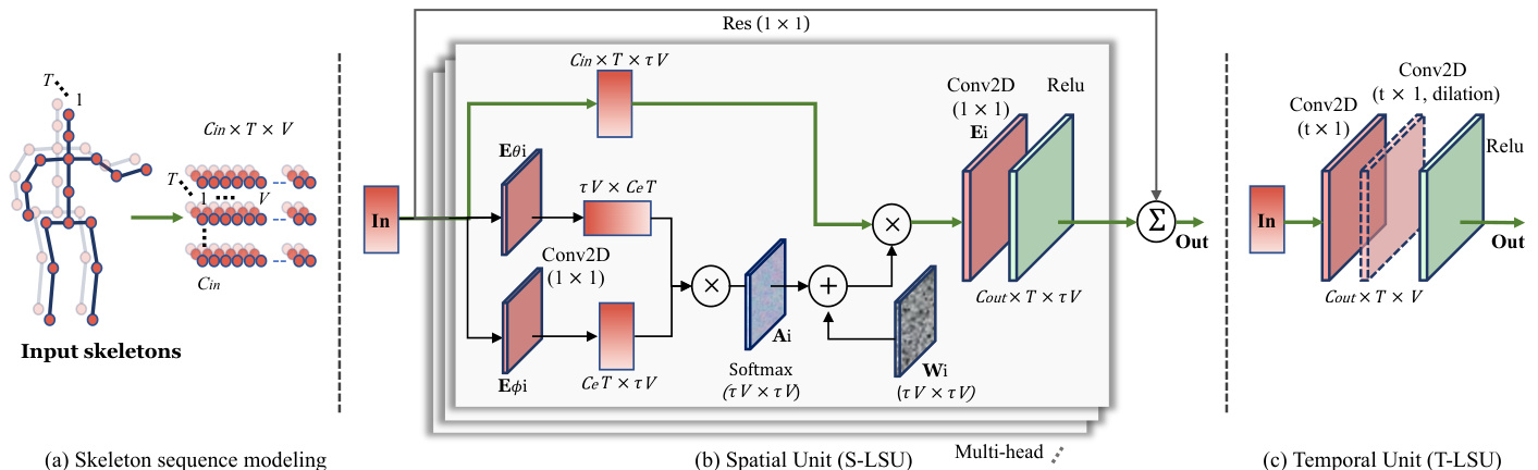 Figure 4. Unified Spatial-temporal Network. (a) The input skeleton sequence is modeled into a matrix with $C_{i n}$ channels $\times T$ frames $\times V$ joints. (b) In each head of the S-LSU, the input data over a temporal sliding window $(\tau)$ is multiplied by a dependency matrix which are obtained from the unified, uniformly initialized $\mathbf{W_{i}}$ and the self-attention based $\mathbf{A_{i}}$ . $\mathbf{E}{i}$ , ${\bf E}{\theta i}$ and $\mathbf{E}{\phi i}$ are for the channel embedding from $C_{i n}$ to $C_{o u t}/C_{e}$ respectively by $(1\times1)$ convolutions. The final output is the sum of the outputs from all the heads. (c) The T-LSU is composed of convolutional layers with $(t\times1)$ kernels . $d$ denotes the dilation coefficient which can be different in each block.