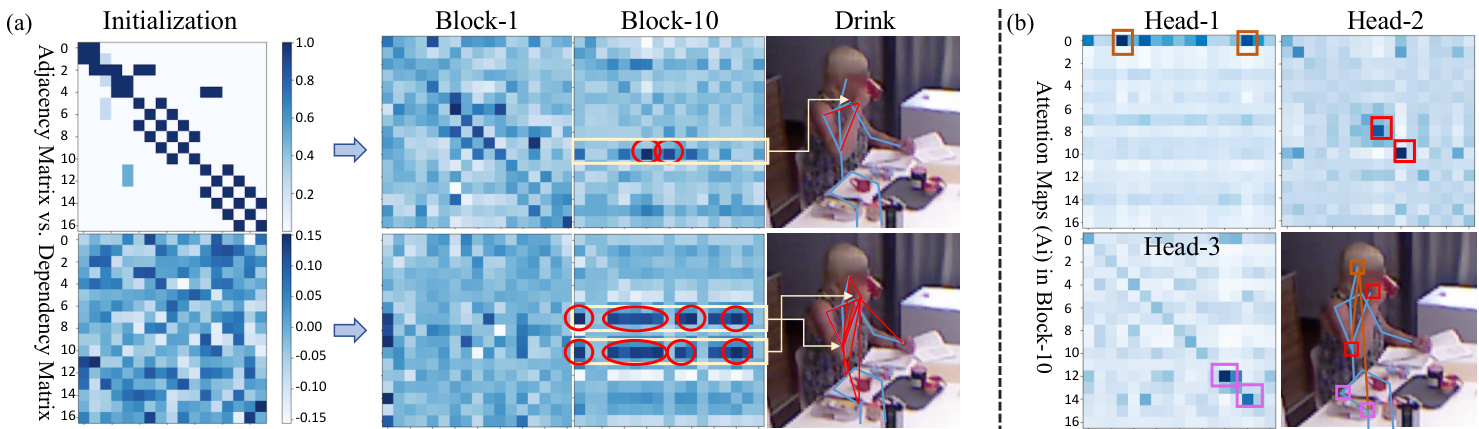 Figure 5. (a) Adaptive Adjacency Matrix [31] (top) vs. Dependency Matrix (bottom) in different blocks for action ”Drink” of Smarthome (right). They have different initial distributions. During training, the dependencies will become optimized representations, that are salient and more sparse in the deeper blocks, while our proposed matrix represents longer range dependencies (indicated by the red circles and red lines). (b) Multi-head attention maps in Block-10. Similar to dependency matrices, attention maps are salient and sparse in the deep block. The different heads automatically learn the relationships between the different body joints (as shown in the boxes and lines with different colors) to process long-range dependencies between joints instead of using pre-defined adjacency matrices.
