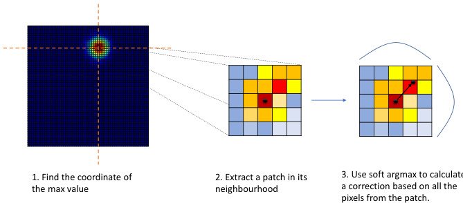 Rather than using the above heuristic, we propose to predict the location of the keypoint by analyzing the pixels in its neighbourhood and exploiting the known targeted Gaussian distribution. For a given heatmap $\mathcal{H}{k}$ , we firstly find the coordinates corresponding to the maximum value $(\hat{y}{k}^{[\bar{1}]},\hat{y}{k}^{[2]})=\arg\operatorname*{max}\mathcal{H}{k}$ and then, around this location, we select a small square matrix $h_{k}$ of size $d\times d$ , where $\begin{array}{r}{l=\frac{d}{2}}\end{array}$ . Then, we predict an offset $(\Delta\hat{y}{k}^{[1]},\Delta\hat{y}_{k}^{[2]})$ by finding a soft continuous maximum value within the selected matrix, effectively retrieving a correction, using a local soft-argmax: