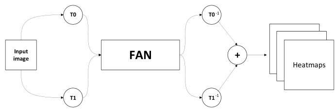 Figure 2: Siamese transformation-invariant training. T0 and T1 are two randomly sampled data augmentation transformations applied on the input image. After passing the augmented images through the network a set of heatmaps are produced. Finally, the transformations are reversed and the two outputs merged.