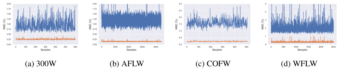 图 3: 采用我们提出的方法(橙色)和标准方法5对多个数据集的真实热图进行编码再解码后的NME。请注意,我们的方法显著降低了所有数据集样本的错误率。