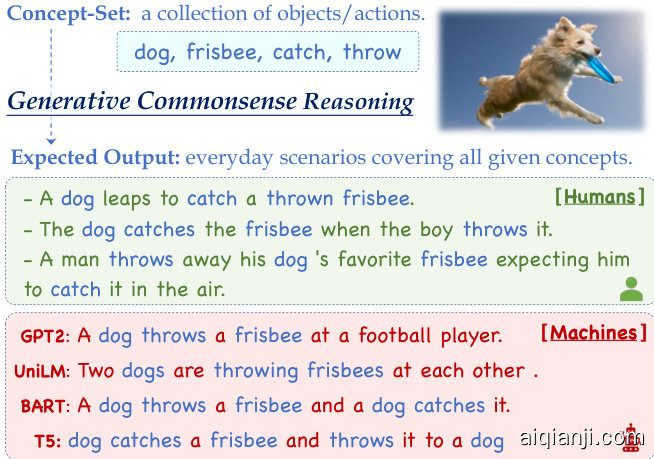 图 1: COMMONGEN数据集示例。GPT-2、UniLM、BART和T5是基于该任务微调的大型预训练文本生成模型。