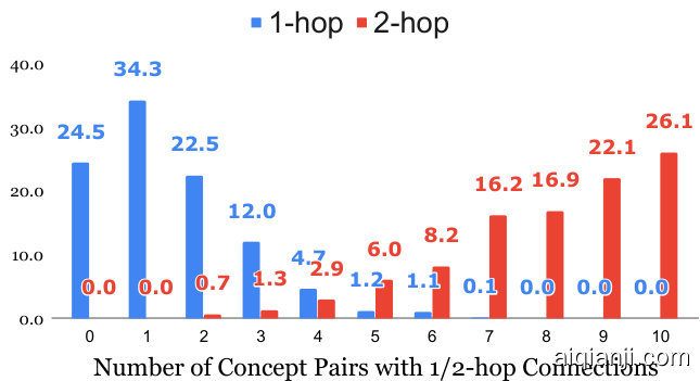 Figure 5: Connectivity analysis in 5-size concept-sets in the test set, each of which consists of 10 concept pairs. For example, 12.0 in blue means: there are  $12%$   concept-sets that have 3 concept pairs with one-hop connections on ConceptNet.