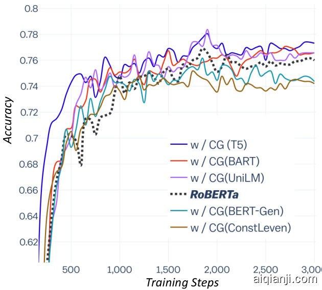 We highlight the performance of original RoBERTa-Large as the baseline. We find that some CommonGen models further improves the perforUniLM mance by a large margin, e.g., 76.9 −→ 78.4 and they converge at better accuracy in the end. Note that BERT-gen and ConstLeven cause negative transfer due to the low quality of generated context. Particularly, we find that the context generated by the T5-based CommonGen model (CG-T5) helps speed up training about 2 times, if we look at 550th steps of CG-T5 $(74.85%)$ and 1,250th steps of original RoBERTa $(74.77%)$ .