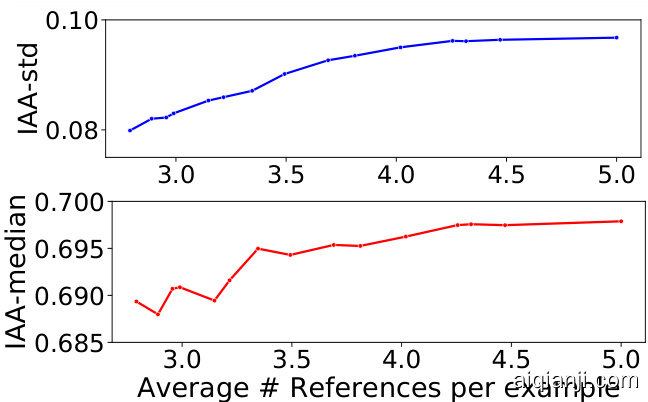 图 4: 标注者间一致性 (IAA) 随平均参考数量增加的标准差 (上) 和中位数 (下) 变化曲线。