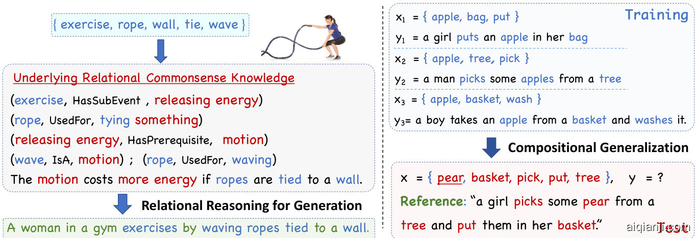 图 2: COMMONGEN面临的两大关键挑战:基于给定概念的常识知识进行关系推理(左),以及对未见概念组合的复合泛化能力(右)。