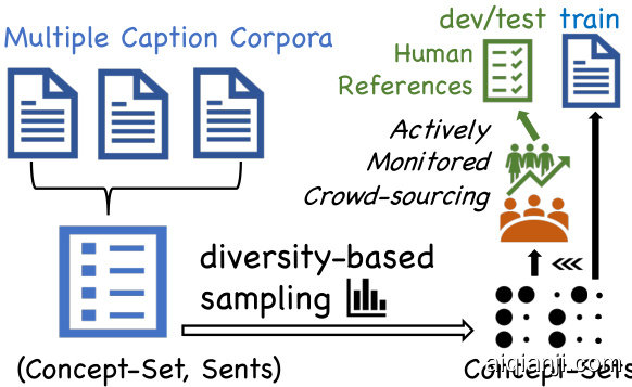 图 3: 展示了我们为COMMONGEN任务构建数据的整体流程。我们利用多个现有字幕语料库采样高频概念集(见3.1节)以反映常见场景。通过AMT众包平台收集人工撰写的开发集和测试集语句(见3.2节),同时动态监控众包人员质量并进行优化。最后,我们给出了COMMONGEN数据集的统计信息及任务难点分析(见3.6节)。
