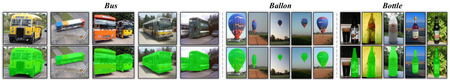 图 5: 我们提出的网络在"Bus"、"Ballon"和"Bottle"对象上的定性结果。