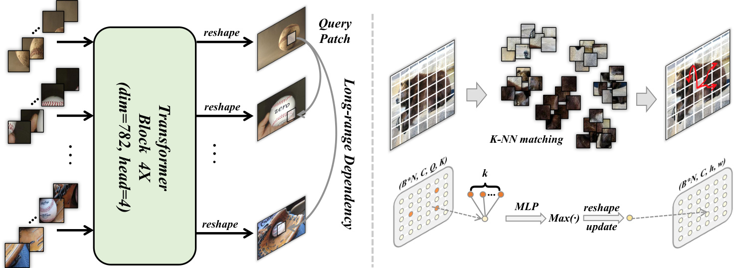 Fig. 3: Detailed illustration of the transformer block and the intra-MLP learning module. Left: A group of images  $\mathcal{T}$   are reshaped into patches. The transformer encoder will output the enhanced patch embeddings implemented by the multi-head MLP. We then reshape all the patches into image-like feature maps. Right: For each query image feature patch, it will match with its top $\mathcal{K}$   potentially corresponding patches. Then, it will be updated by aggregating different sub-region representations using MLP operation.