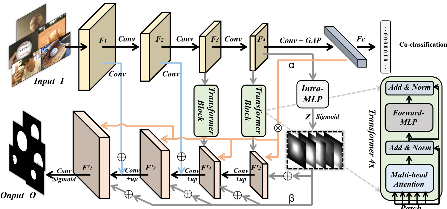 Fig. 2: The pipeline of our proposed method. The given group-based input images   $\mathcal{T}$   are first fed into the encoder, yielding the multi-scale feature maps  $F$  . Then we employ transformer blocks (see Fig 3 for more details) on the last two layers to capture the images long-range correlations to model the patch structured similarities among the relevant objects, which will output the updated co-attention layers   $F^{\prime}$  . In addition, the last layer feature are passed through a classification sub-network and an intra-MLP module. The former exploits the co-category associated information and the latter produce the self-masks. Finally, they are combined with the updated co-attention layers to enhance the co-object semantic-aware regions in the pyramid network structure-like decoder to produce the output  $\mathcal{O}$  .